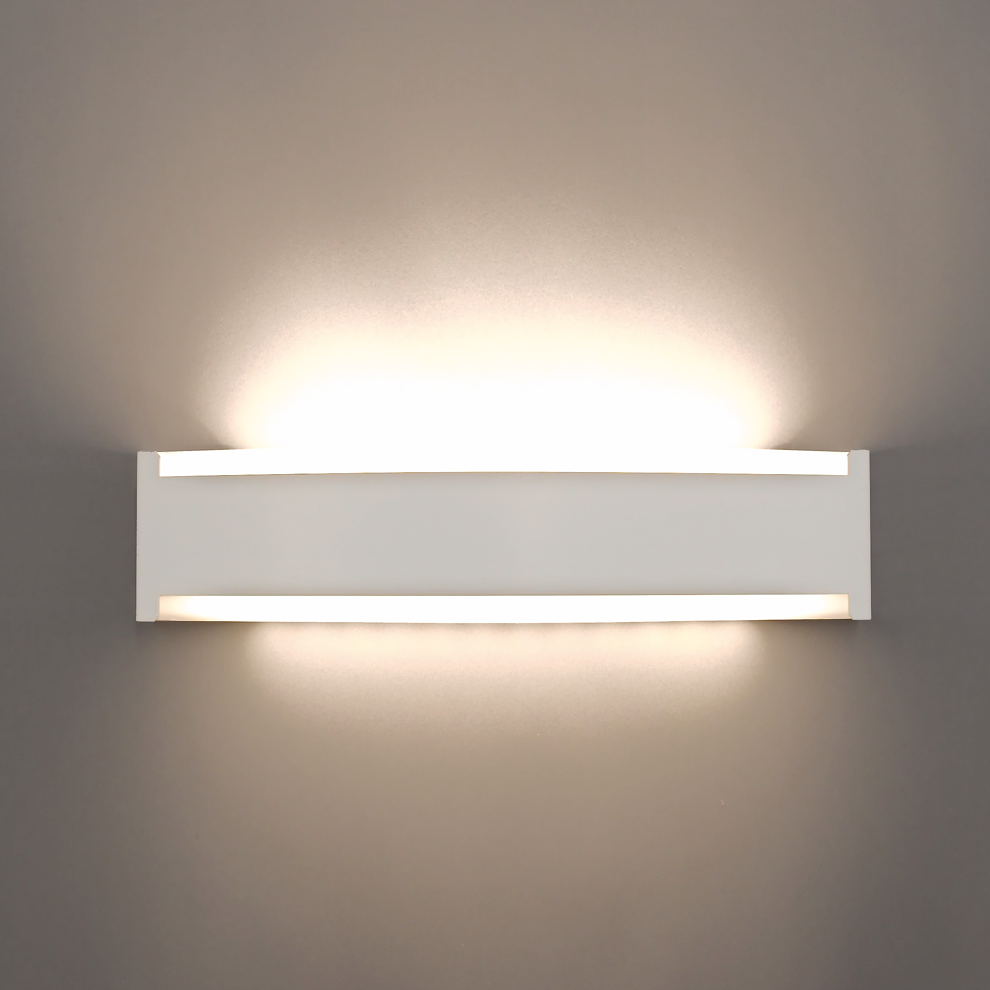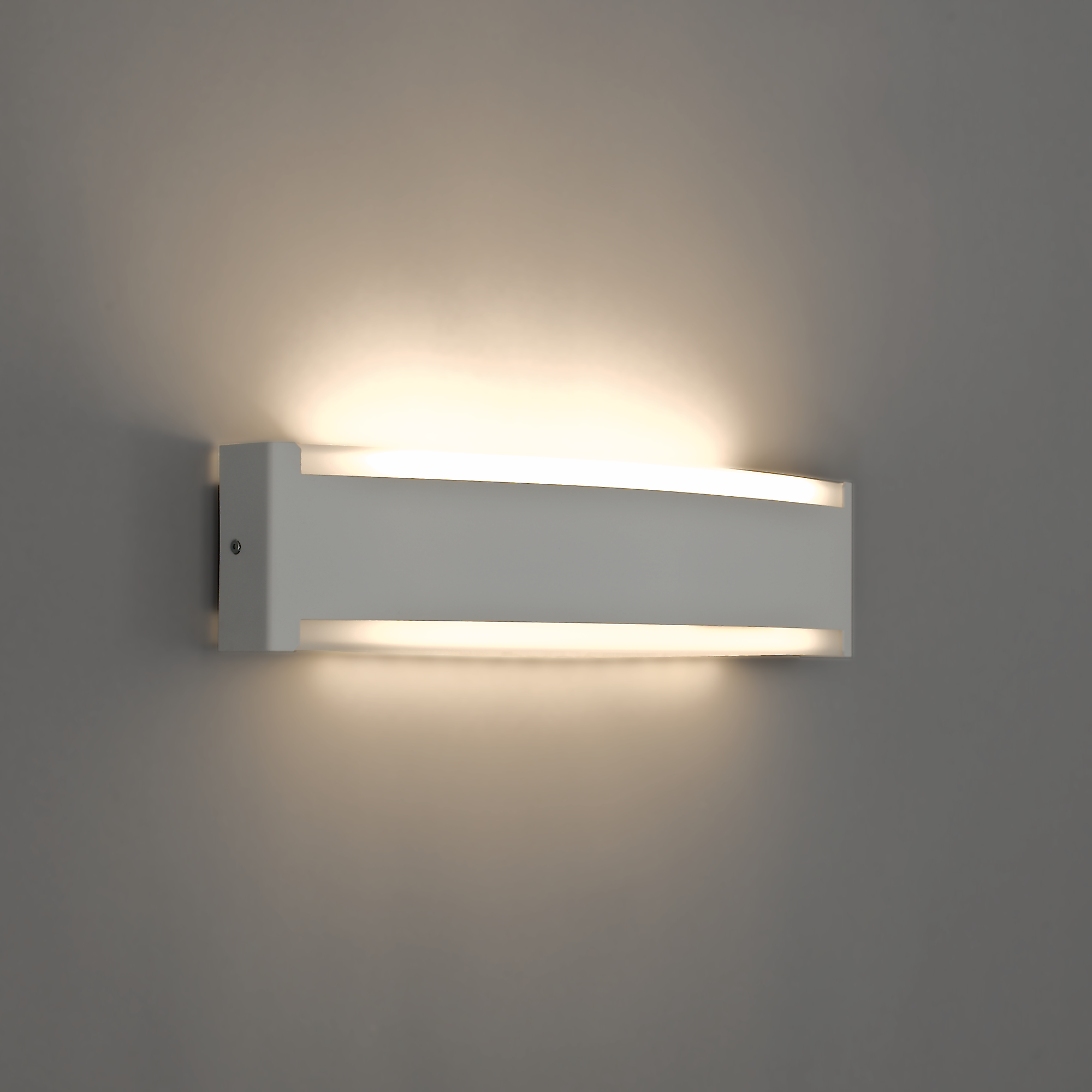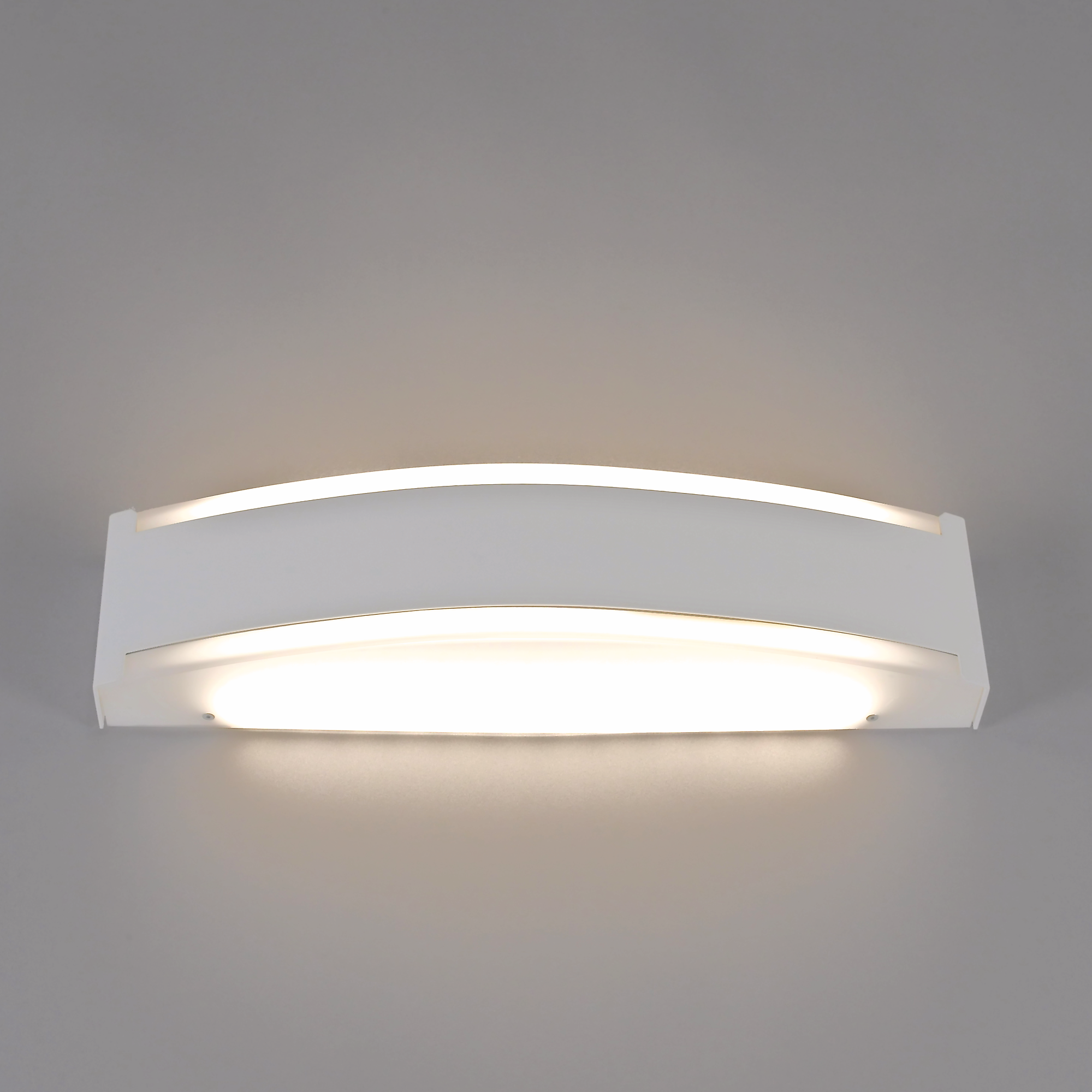 Die opale Abdeckung im unteren Bereich sorgt für eine homogene, weich streuende Direktbeleuchtung, während die klare Abdeckung im oberen Bereich für die breit abstrahlende Indirektbeleuchtung zuständig ist. Eingesetzte Kunststoffblenden im oberen und unteren Bereich erzeugen zusätzlich eine dezente Frontaufhellung und unterstreichen das elegante Erscheinungsbild der Leuchte.