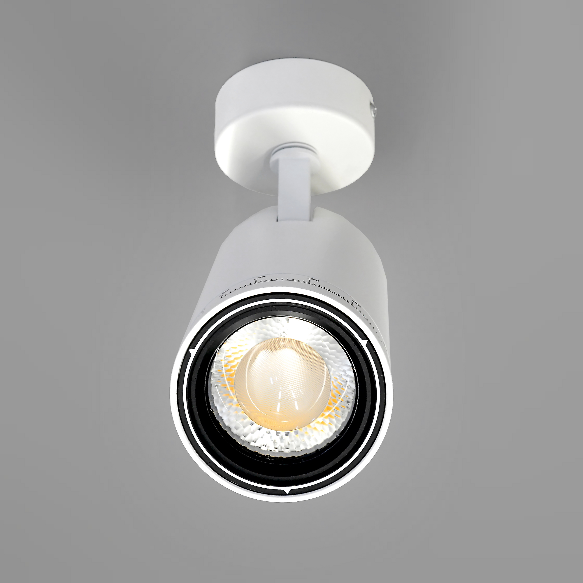 Leistungsstarker LED-Strahler l.une ceiling für Deckenanbauanwendungen in den Varianten S, L und Zoom. Der l.une ceiling Strahler ist dreh- und schwenkbar (bis 90°) und ermöglicht eine präzise Ausrichtung des Lichts auf Ausstellungs-, Verkaufs- oder Arbeitsflächen. Das Gehäuse besteht aus robustem Aluminiumdruckguss und dient zugleich als passiver Kühlkörper zur thermischen Stabilisierung. Die integrierte Betriebselektronik ist platzsparend in das Gehäuse eingebaut und in schaltbarer oder optional dimmbarer Ausführung erhältlich. Die eingesetzte Hochleistungs-LED-Platine liefert flimmerfreies, rotationssymmetrisches Licht mit guter Farbwiedergabe und verschiedenen Abstrahlwinkeln je nach Anwendung. Die Zoom-Variante erlaubt eine stufenlose Einstellung des Lichtaustrittswinkels von 12° bis 60°, ideal für wechselnde Lichtanforderungen. Erhältlich in verschiedenen Lichtfarben.