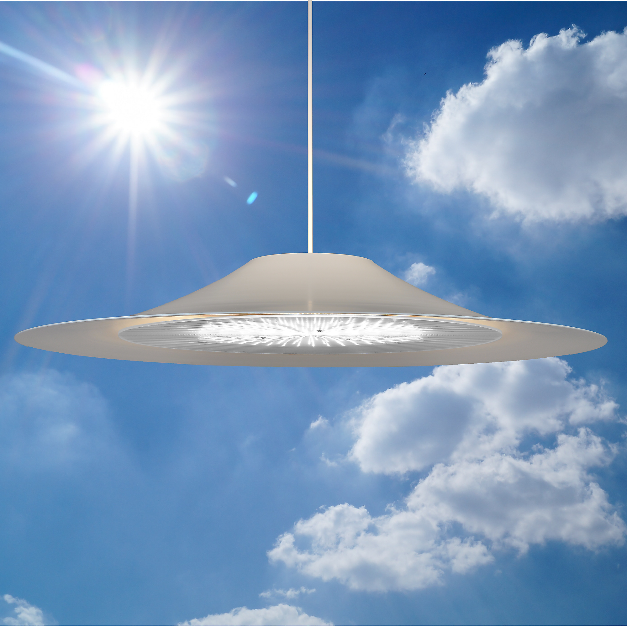 Die Leuchte verfügt über einen kombinierten Direkt-/Indirektlichtanteil, der gemeinsam schalt- und dimmbar ausgeführt ist. Der indirekte Lichtanteil sorgt für eine dezente Deckenaufhellung und ist durch eine klare Abdeckung geschützt. Die direkt abstrahlende Unterseite ist mit einer radial geprägten, konischen Microprismenscheibe ausgestattet, die eine blendfreie Lichtverteilung und natürliches Licht mit Sonnenlicht-LEDs bietet, das die visuelle Wahrnehmung verbessert und Ermüdung reduziert.