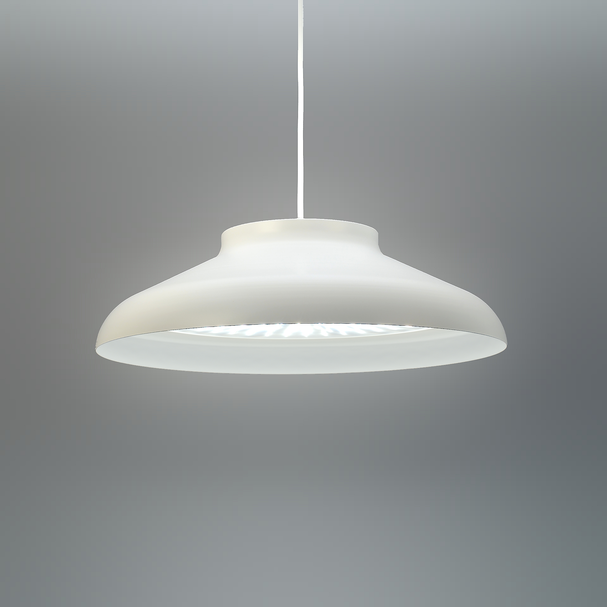 Der Leuchtenschirm besteht aus pulverbeschichtetem Aluminiumblech, erhältlich in RAL-Farben. Die Pendelleuchte wird über eine weiße Anschlussleitung abgehängt, mit standardmäßigem Pendelset (2000 mm Länge). Die Betriebselektronik ist im Leuchtengehäuse integriert, was eine einfache Montage ermöglicht. Optional sind Umbausätze für Bestandsleuchten, etwa in Bildungseinrichtungen, verfügbar.