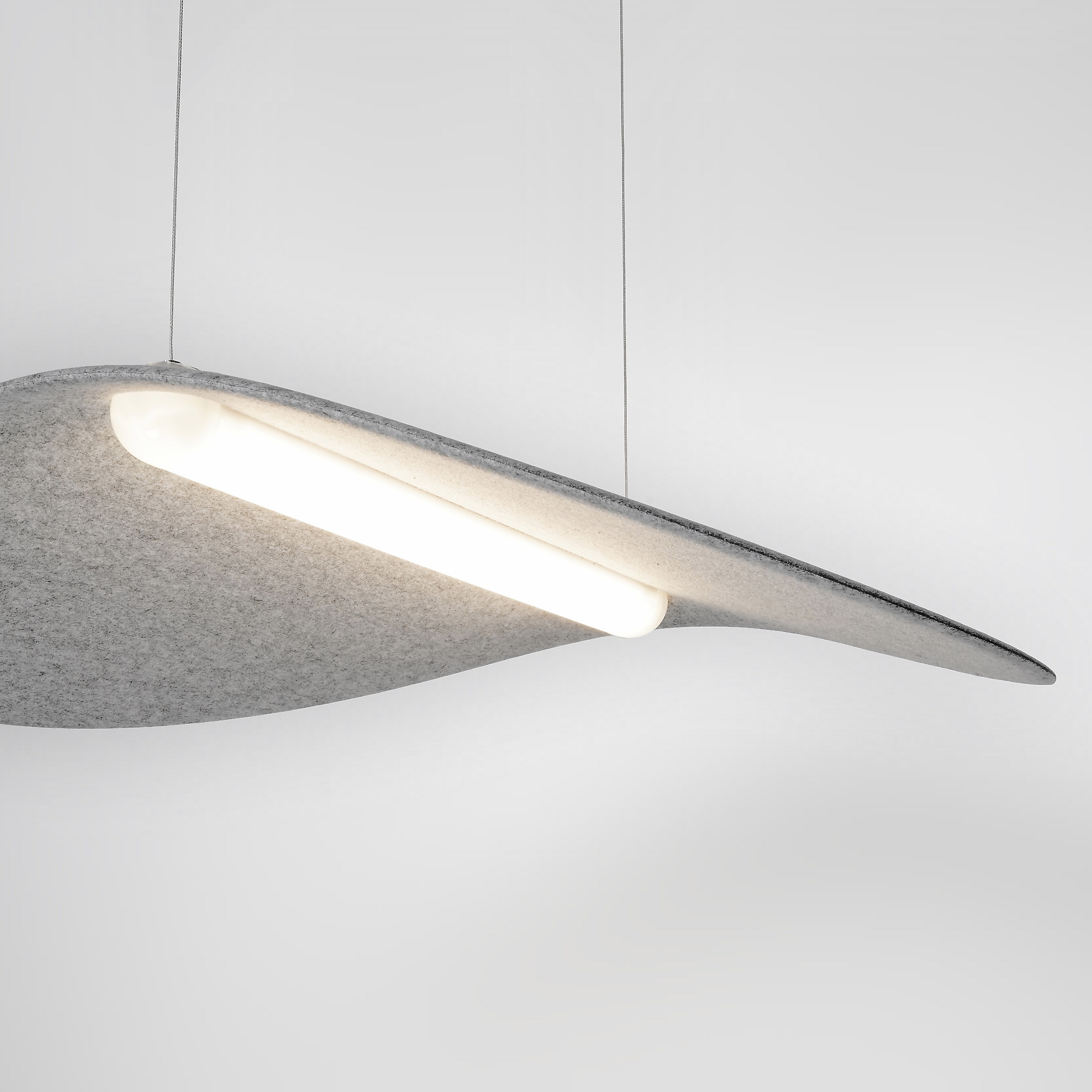 Die Pendelleuchte x.leaf grau ist eine moderne, designprämiierte LED-Leuchte mit schallabsorbierender Wirkung, ideal für geräuschintensive Innenräume. Sie kombiniert leistungsstarke Beleuchtung mit raumakustischer Funktion und wurde speziell für den Einsatz in Büros, Konferenzräumen, Schulen, Kitas, Foyers, Gastronomie und Hotellerie entwickelt. Die Pendelleuchte ist in zwei Größen (S und L) erhältlich und bietet Varianten mit opaler oder blendfreier Microprismen-Abdeckung. Das charakteristische Merkmal der x.leaf grau ist das elegant geschwungene, schwebend wirkende Segel aus akustisch wirksamem Formvlies. Dieses Material ist lichtecht, formbeständig, einfach zu reinigen und erfüllt die Anforderungen des OEKOTEX® Standard 100. Die Segel stehen in 2 Farbvarianten zur Auswahl: anthrazitgrau oder hellgrau. Die Leuchte bietet eine ausgewogene Lichtverteilung mit direktem und indirektem Lichtanteil. Das Lichtvolumen entspricht dem einer vollwertigen Büroleuchte. Die opale Diffusorabdeckung sorgt für eine weiche Lichtverteilung, während die Version mit Microprismenoptik für blendfreies Licht am Bildschirmarbeitsplatz (BAP-gerecht) verfügbar ist. Der hohe indirekte Lichtanteil trägt zur gleichmäßigen Deckenaufhellung bei und unterstützt eine angenehme Raumwirkung. Die Schirmform trägt zur Schallabsorption bei und entspricht der Schallabsorptionsklasse D gemäß DIN EN ISO 11654. Die Leuchte ist über eine transparente Zuleitung mit einem schlanken, unauffälligen Baldachin verbunden, in dem auch das flimmerfrei arbeitende Betriebsgerät integriert ist. Die Pendellänge beträgt standardmäßig 2000 mm. Die x.leaf wurde von Phoenix Design gestaltet und mit Designreisen wie dem iF DESIGN AWARD und dem FOCUS OPEN ausgezeichnet. Sie überzeugt durch ihr nachhaltiges, funktionales Design, das Licht und Akustik wirkungsvoll kombiniert.