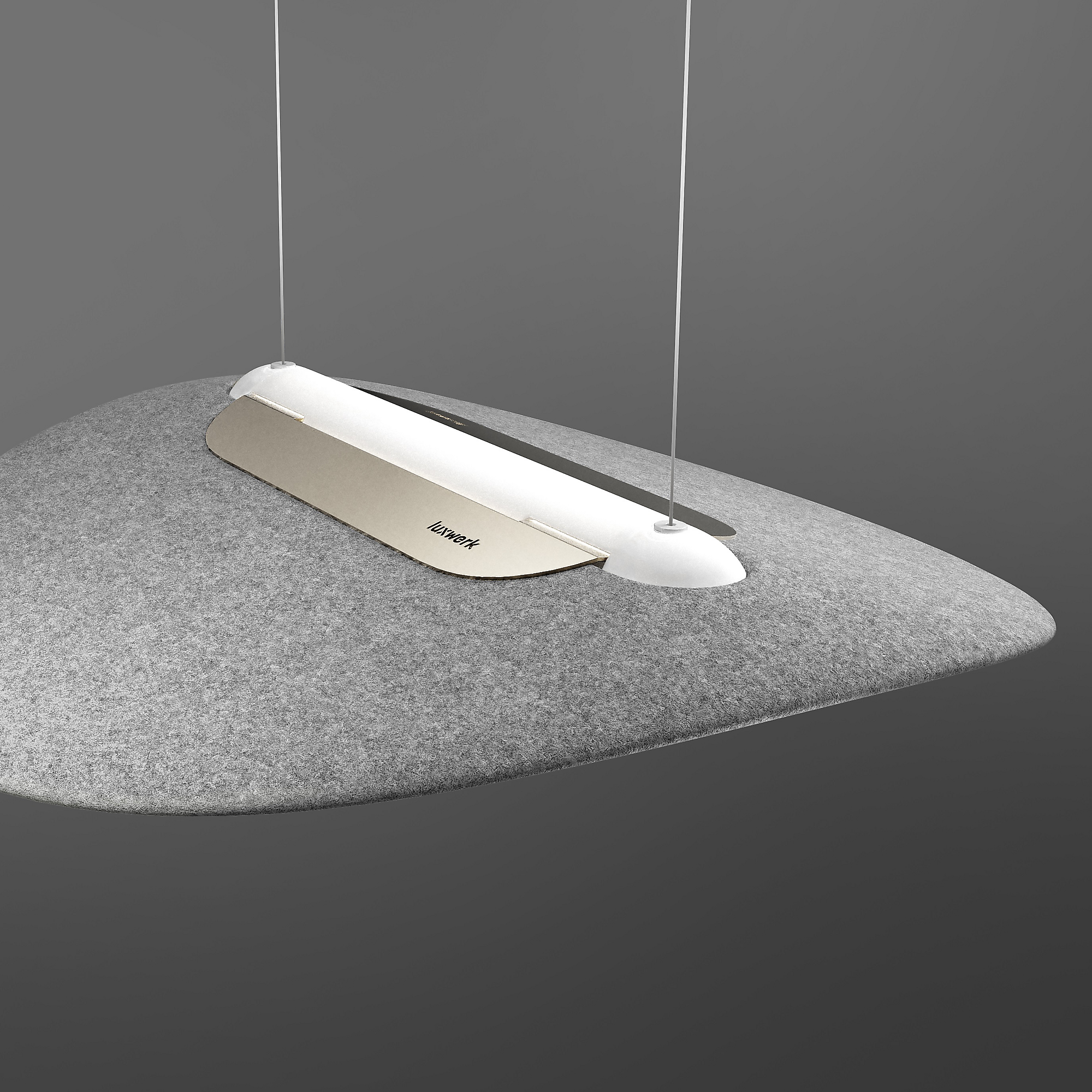 Die Schirmform trägt zur Schallabsorption bei und entspricht der Schallabsorptionsklasse D gemäß DIN EN ISO 11654. Die Leuchte ist über eine transparente Zuleitung mit einem schlanken, unauffälligen Baldachin verbunden, in dem auch das flimmerfrei arbeitende Betriebsgerät integriert ist. Die Pendellänge beträgt standardmäßig 2000 mm.