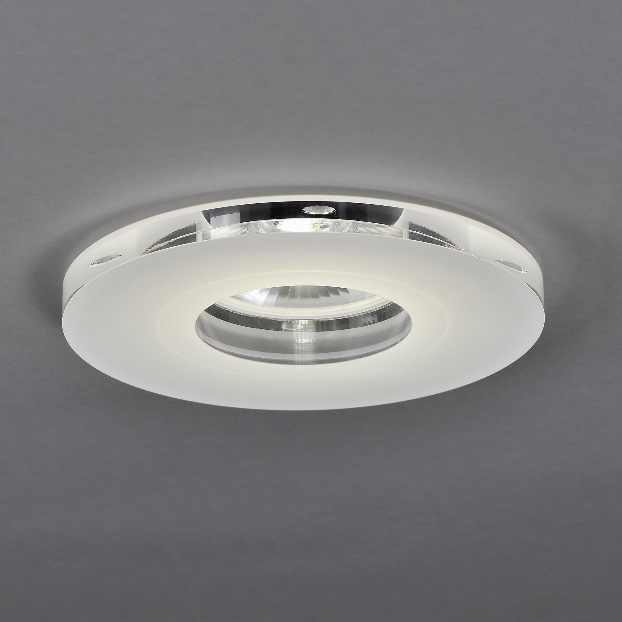 Das Leuchtengehäuse besteht aus präzise verarbeitetem Aluminiumdruckguss mit einer pulverbeschichteten Oberfläche in Weiß RAL 9003. Statt eines klassischen Metalleinbaurings ist das sogenannte R-Element – ein dekorativer Acrylglasring – Teil des Designs. Dieser Ring ist hochglanzpoliert an der Außenkante und satiniert auf der Unterseite. Er sorgt durch gezielte Lichtauskopplung für einen subtilen Lichthof, der die Leuchte optisch in die Decke einbettet und zugleich einen sanften, indirekten Lichteffekt erzeugt.