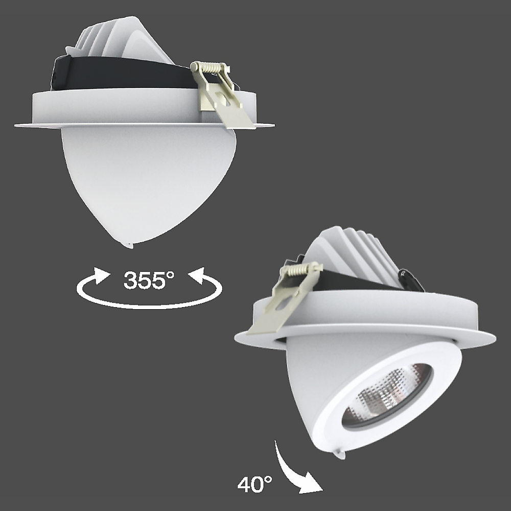Die Leuchte ist dreh- und schwenkbar (360° / 60°), was eine flexible Ausrichtung des Lichtkegels ermöglicht. Sie eignet sich für Anwendungen mit fokussiertem Akzentlicht bei gleichzeitig hoher Effizienz und Farbwiedergabe.